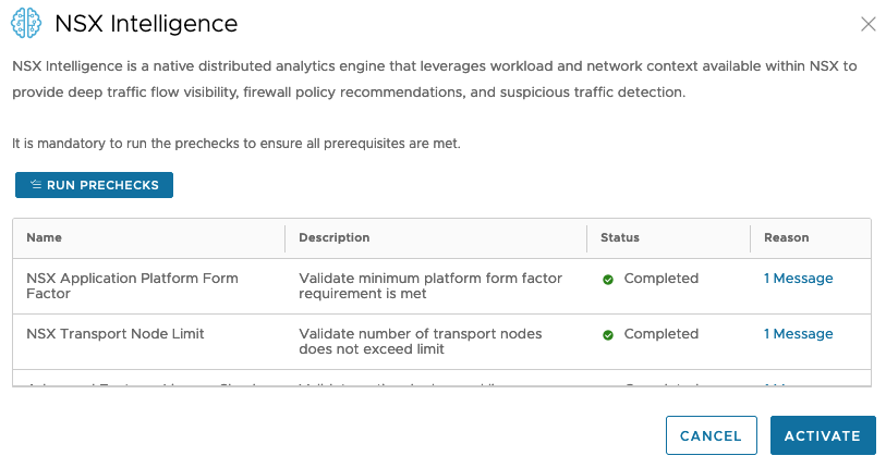 To enable the NSX Intelligence feature we hover over the NSX Intelligence tile and click Activate. A number of pre-checks must be run before we can activate the feature:
