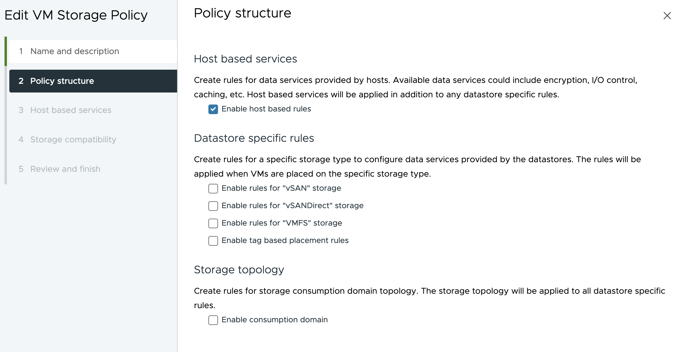 Give it a name and enable host based rules (my vSphere environment uses VMFS-backed storage):