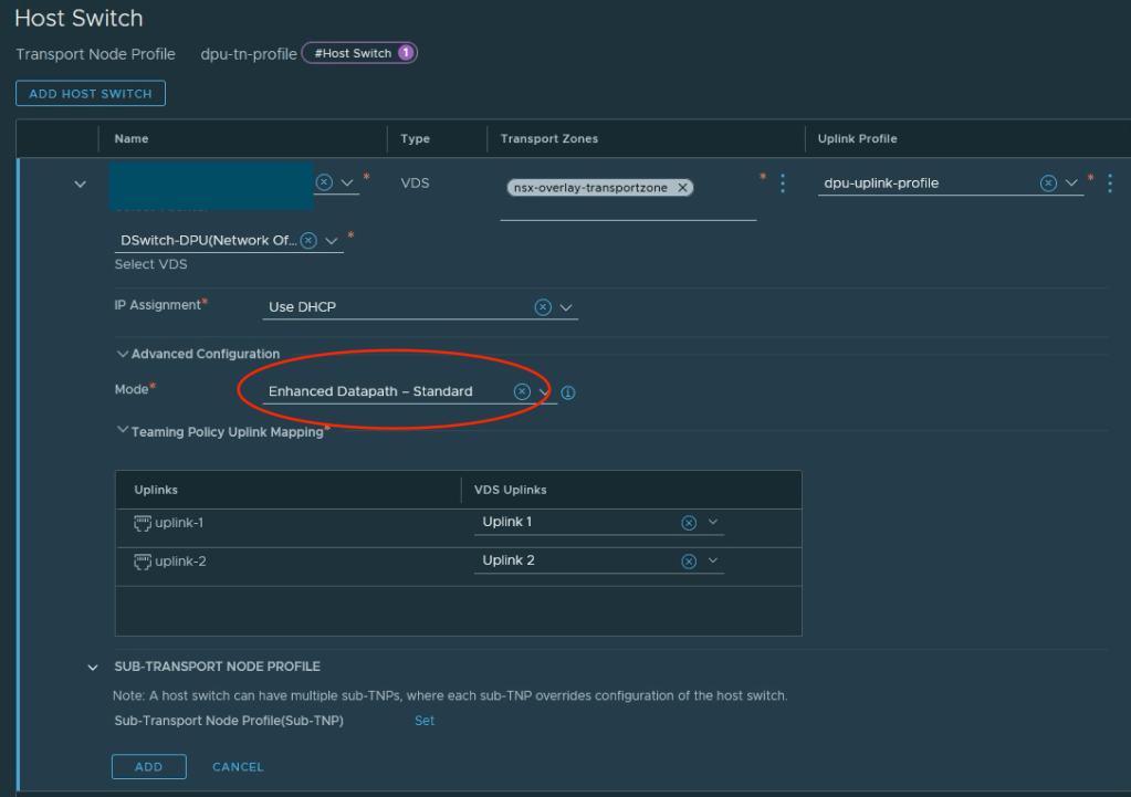 Note that under Advanced Configuration > Mode we must select Enhanced Datapath (either Standard or Performance) as the Mode when the selected VDS is a DPU compatible VDS.
