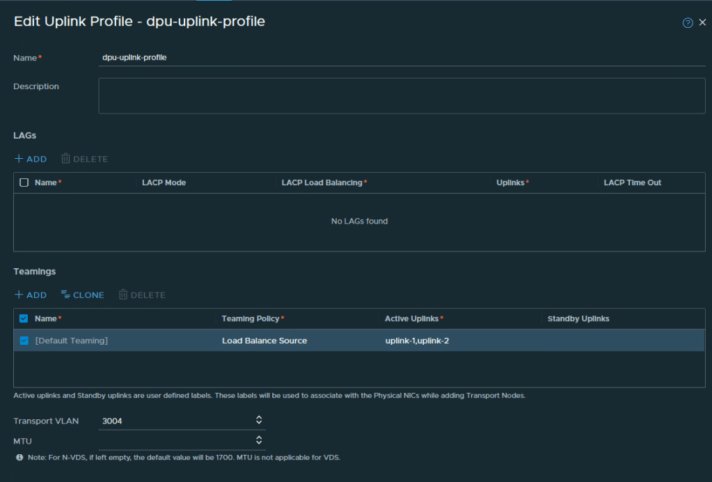 First we create an uplink profile. Navigate to System > Fabric > Profiles > Uplink Profiles and click + Add Profile. We’ll give the uplink profile some descriptive name like dpu-uplink-profile, configure teaming and optionally a transport VLAN when overlay networking is in scope:
