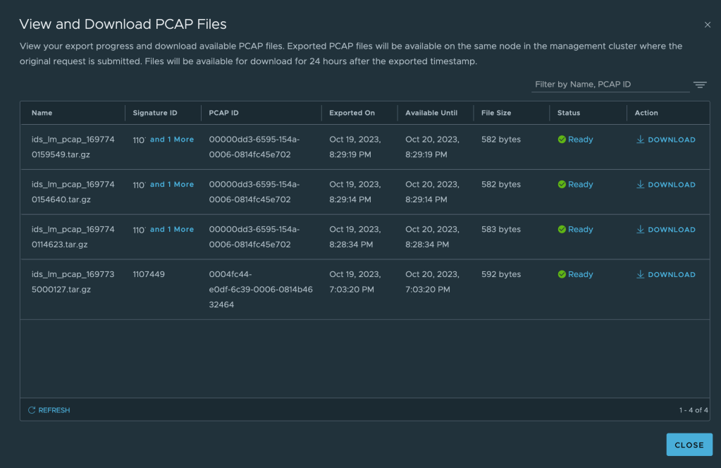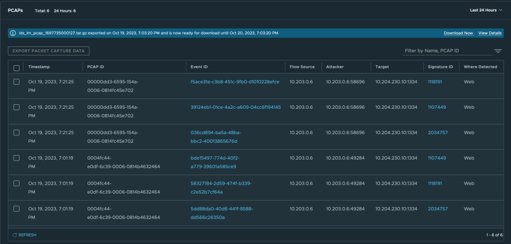 A nice new feature that shipped with NSX 4.1.2 is the ability to download packet capture files (PCAPs) containing packets that were detected or prevented by NSX IDS/IPS.