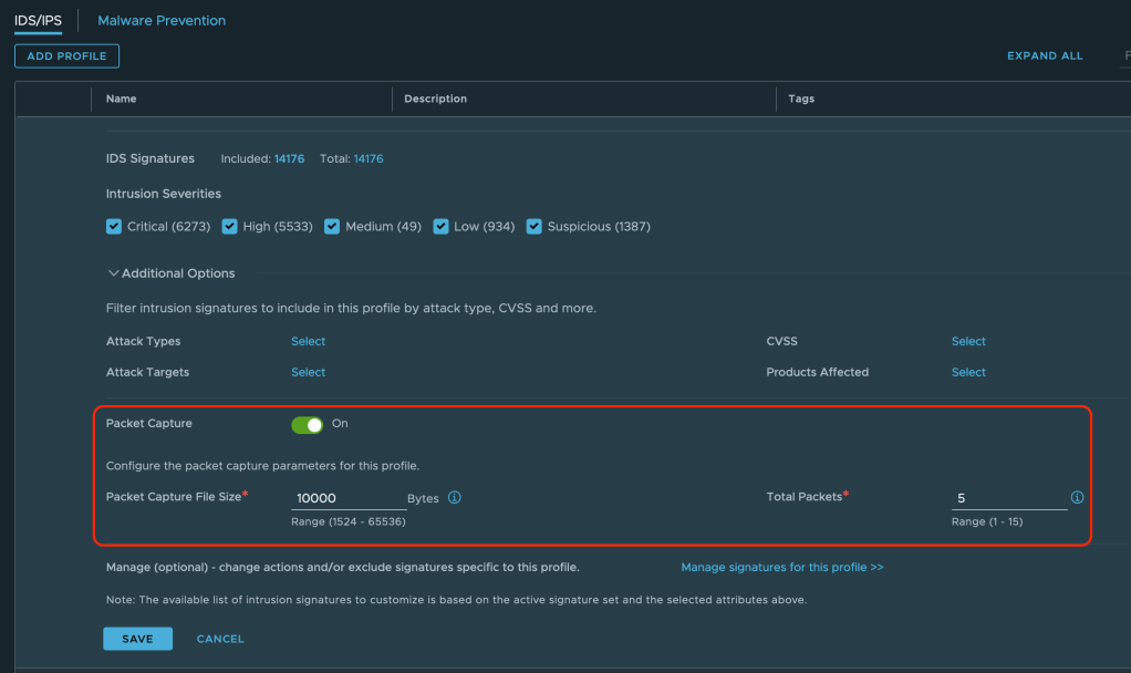 The feature itself is enabled within an NSX IDS/IPS Profile which are found under Security > IDS/IPS & Malware Prevention > Profiles. Up until now IDS/IPS profiles were used to group signatures, which are then applied to selected applications, but now they also contain a section where packet capture is managed. This is interesting as it gives us the flexibility to enable packet capture on a per application level.