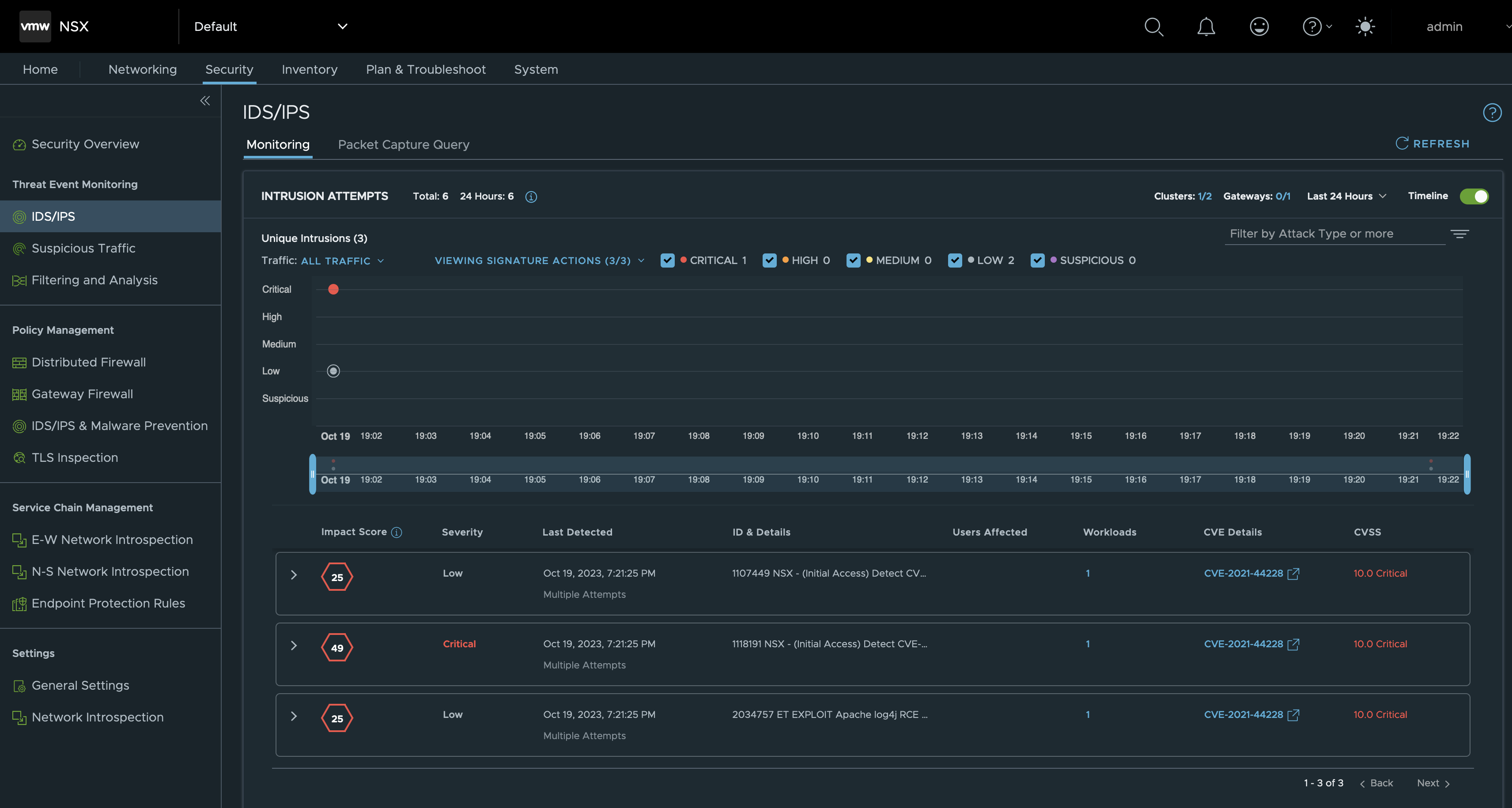 Let’s begin with a look under Security > IDS/IPS > Monitoring in the NSX Manager UI. As we see there have been some intrusion attempts: