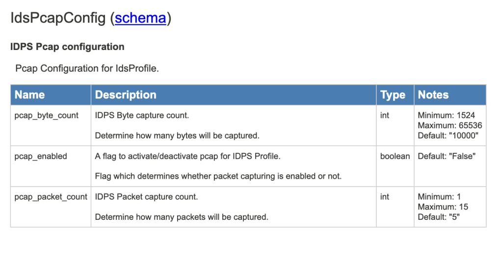 The request body that goes along with this PATCH request contains the necessary configuration (check the NSX REST API documentation for more information on this). Specifically for the packet capture feature a new type “IdsPcapConfig” has been added: